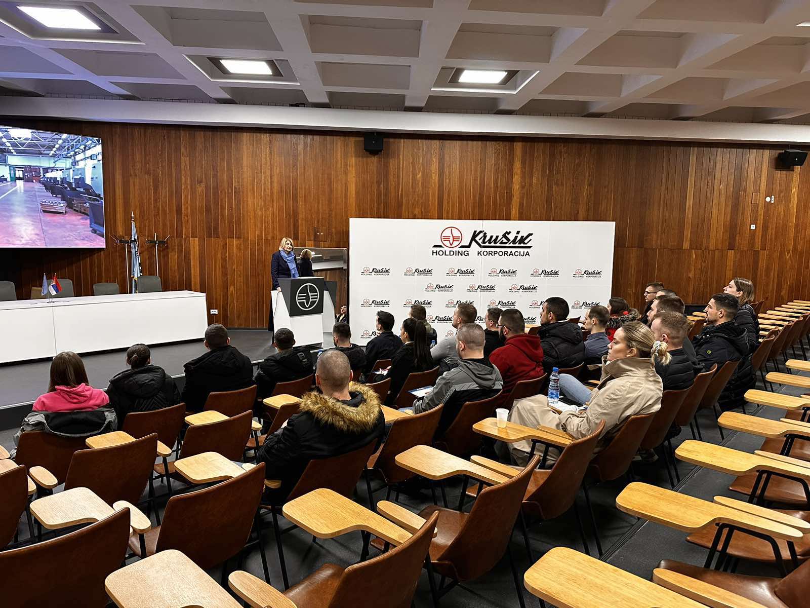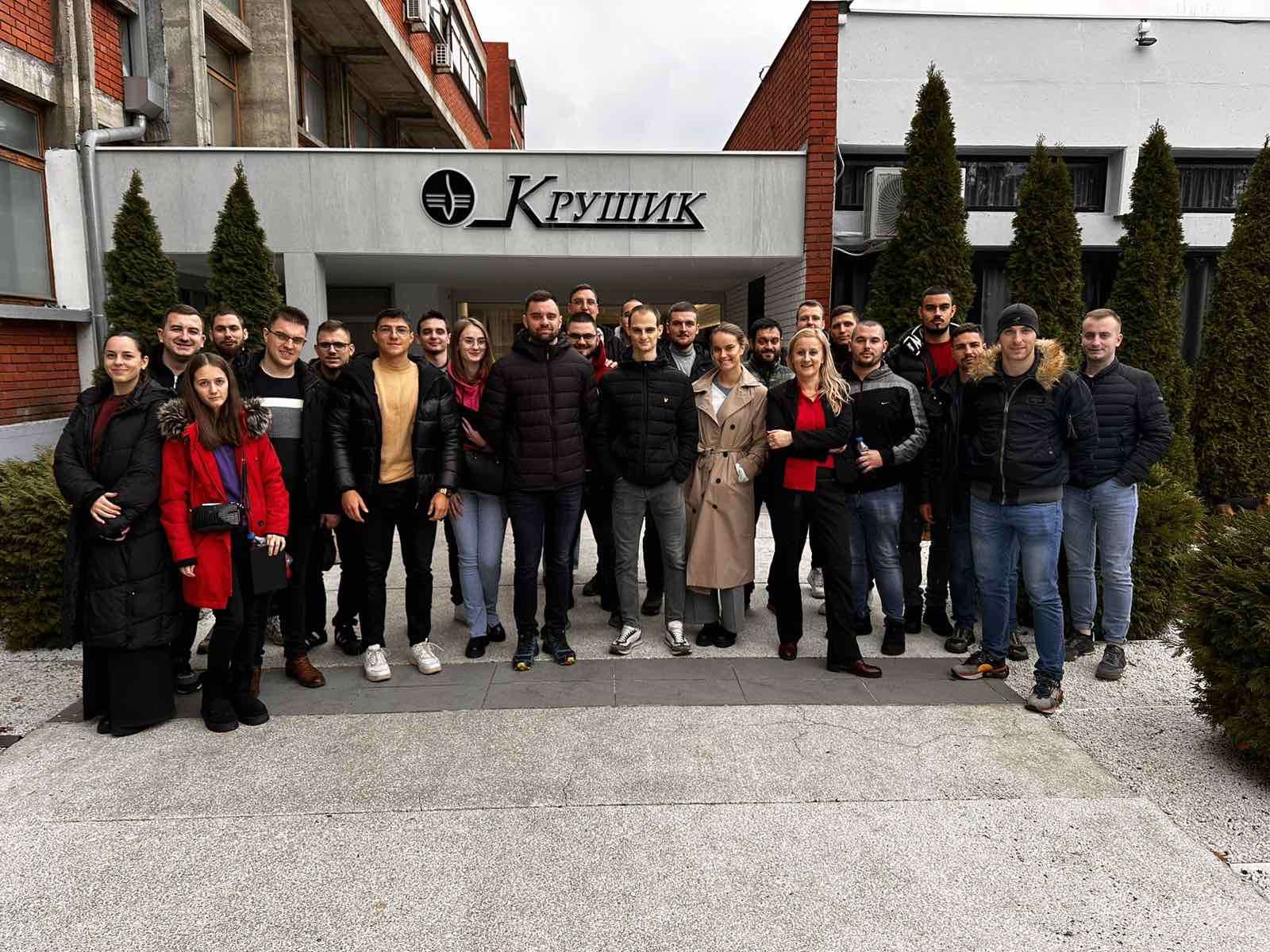 У новом амфитеатру, госте је поздравила госпођа Јованка Андрић, вд генералног директора. Након речи добродошлице и кратке видео презентације, уследио је обилазак одређених фабричких погона. Студенти су имали прилику да у пратњи представника, младих и успешних инжењера Крушика, из прве руке виде како се одвија производња одређених елемената.